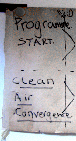 You can see the invitation and the guidance for the event - given to attendees on the day - below. The convenvor - Andrew Wood who co-ordinates Network for Clean Air, facilitated the event but the attendees created the outcome. There were two spaces - one with a screen, laptop, data projector, flip chart and chairs, and another with just a flip chart and chairs. Both spaces could be re-organised, and other stationary and materials were provided. At the start of the Convergence then a programme was constructed with the participants, to timetable the two spaces. However, only one of the two spaces were used, as shown in the programme above.